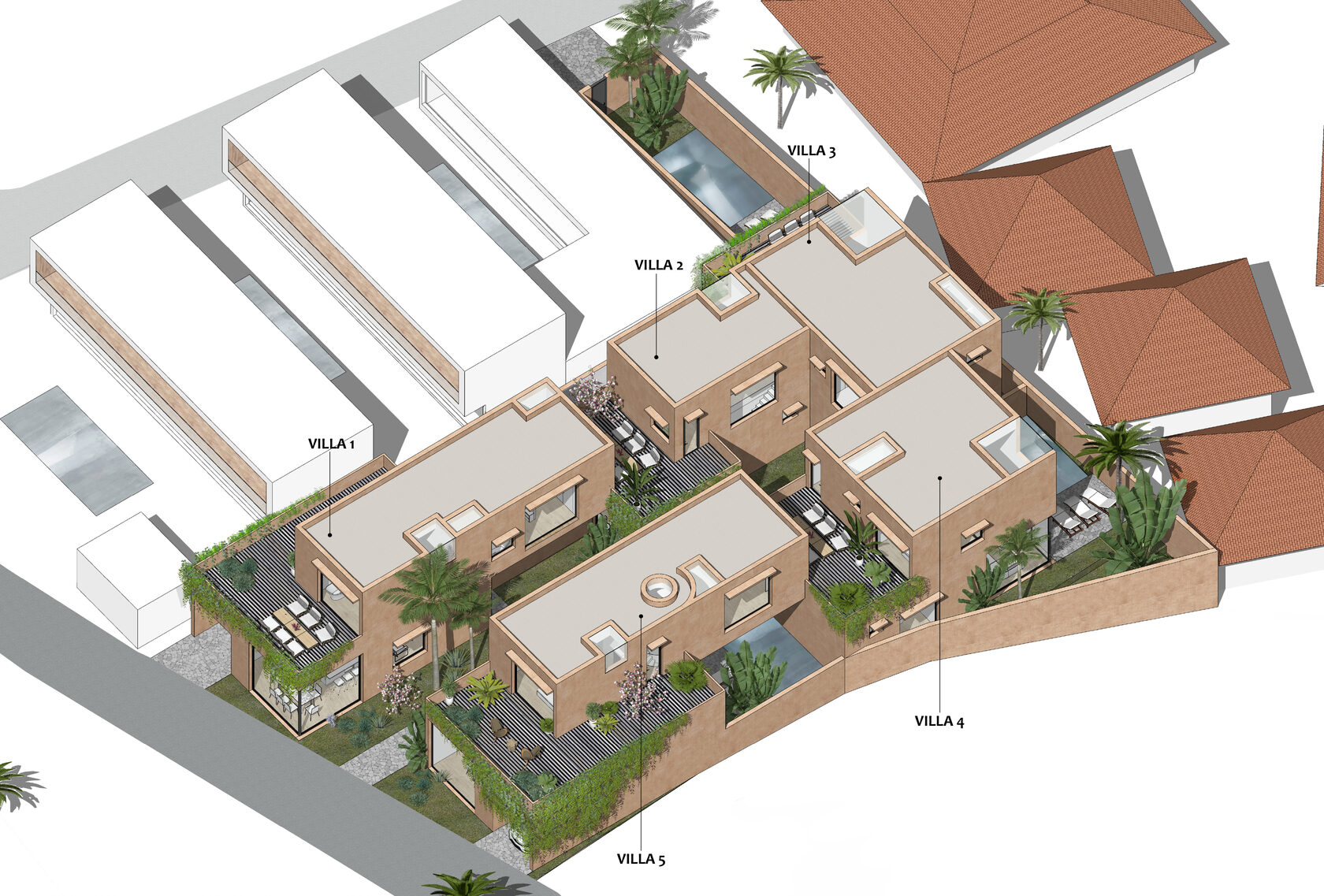Five Stories is a complex of five different villas, connected in one complex, located in Bali. Each villa has its unique layout with various interior solutions, such as a large atrium in the living room, a window in the bathroom, a spiral staircase, and other features.